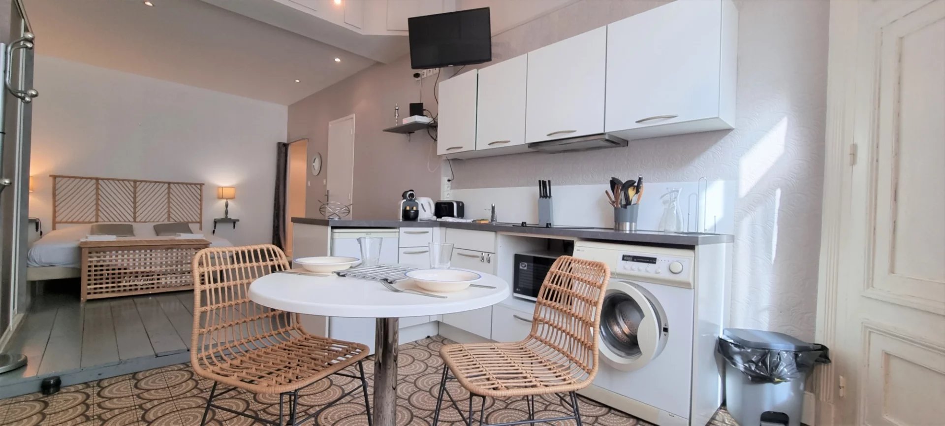 Le coin nuit de cet appartement meublé est composé d’un lit double 160 x 200 cm. Vous y trouverez également deux chevets et une TV écran plat.